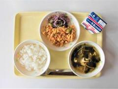 白ご飯、牛乳、わかめスープ、ツナそぼろ、しそあえ