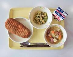 コッペパン、牛乳、コーンスープ、とうふハンバーグ、レモンあえ、小袋ソース でした。