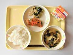 白ご飯、牛乳、赤だし、魚の南蛮漬け、もやしのごまあえ