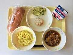 小型パン、牛乳、ジャージャーめん、パオズ:、レモンあえ