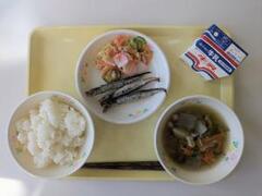 白ご飯、牛乳、きんぴらごぼう、シシャモフライ:、梅カツオあえ