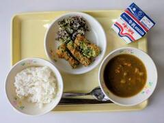白ご飯、牛乳、カレー、ちくわの磯辺揚げ:、しそあえ