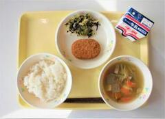 白ご飯、牛乳、わかめスープ、ツナそぼろ、しそあえ