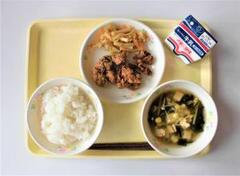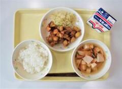 白ご飯、牛乳、すまし汁、鶏肉とさつまいもの揚げ煮、たくあんあえ