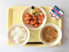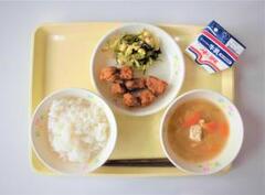 白ご飯、牛乳、ABCスープ、鶏肉のから揚げ、海藻サラダ