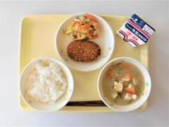 白ご飯、牛乳、かしわ汁、さといもコロッケ、ひじきサラダ
