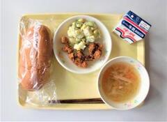 コッペパン、牛乳、キャベツスープ、豚肉のかりんとう揚げ、ポテトサラダ