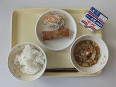 白ご飯、牛乳、八宝菜、春巻き、春雨サラダ