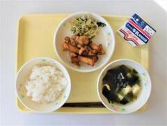 白ご飯、牛乳、わかめスープ、鶏肉とさつまいもの揚げ煮、ごまあえ