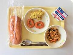コッペパン、牛乳、大豆とミートボールのケチャップ煮、ほうれん草オムレツ、コーンサラダ