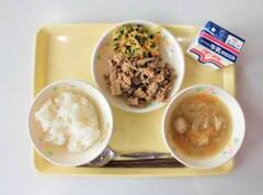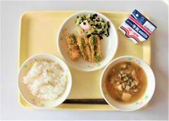 白ご飯、牛乳、豚肉のピリ辛スープ、ちくわの磯辺揚げ、酢の物
