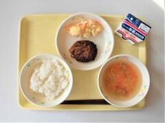 白ご飯、牛乳、コンソメスープ、ハンバーグ、ポテトサラダ
