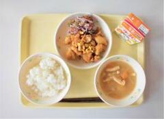 わかめごはん、牛乳、ピリからみそ汁、とり肉のからあげ、海藻サラダ でした。