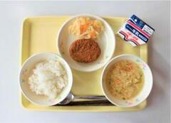 白ご飯、牛乳、親子汁、野菜コロッケ、たくあんあえ
