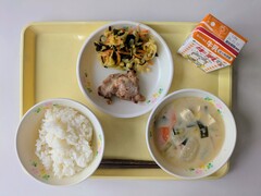白ご飯、牛乳、豆乳スープ、鶏肉の照り焼きレモンじょうゆ、わかめサラダ