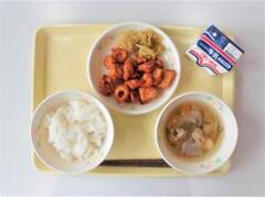 白ご飯、牛乳、けんちん汁、鶏肉とちくわのケチャップ煮、おひたし