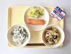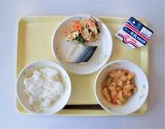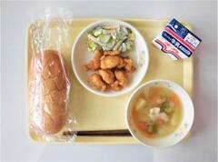コッペパン、牛乳、春野菜のスープ煮、ささみのレモン煮、マカロニサラダ