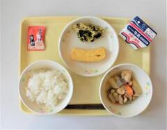 白ご飯、牛乳、かぼちゃのそぼろ煮、五目厚焼玉子、ゆずあえ