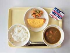 白ご飯、牛乳、カレー、オムレツ、大根サラダ