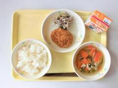 白ご飯、牛乳、わかめスープ、ツナそぼろ、しそあえ