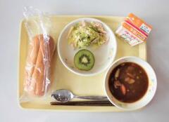 コッペパン(県産小麦使用)、牛乳、豚肉のトマトシチュー、裸麦入りサラダ、キウイフルーツ