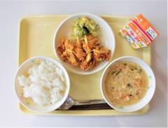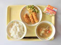 白ご飯、牛乳、おでん、ちくわの更紗揚げ、枝豆サラダ