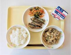 白ご飯、牛乳、糸こんにゃくの卵とじ、小イワシの南蛮漬け、おひたし