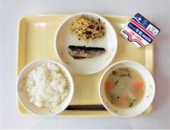 白ご飯、牛乳、じゃがいものみそ汁、イワシのしょうが煮、昆布あえ