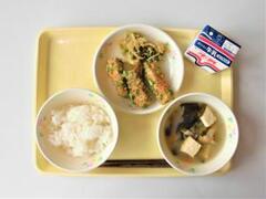 白ご飯、牛乳、春雨スープ、かき揚げ、ビーンズサラダ